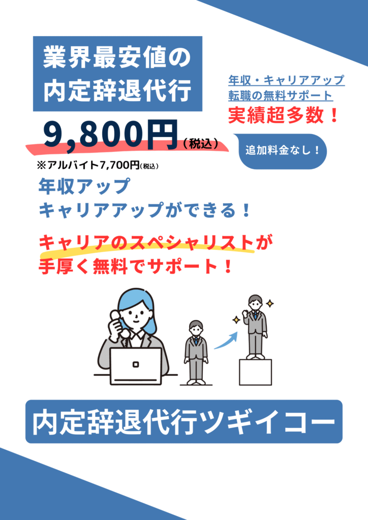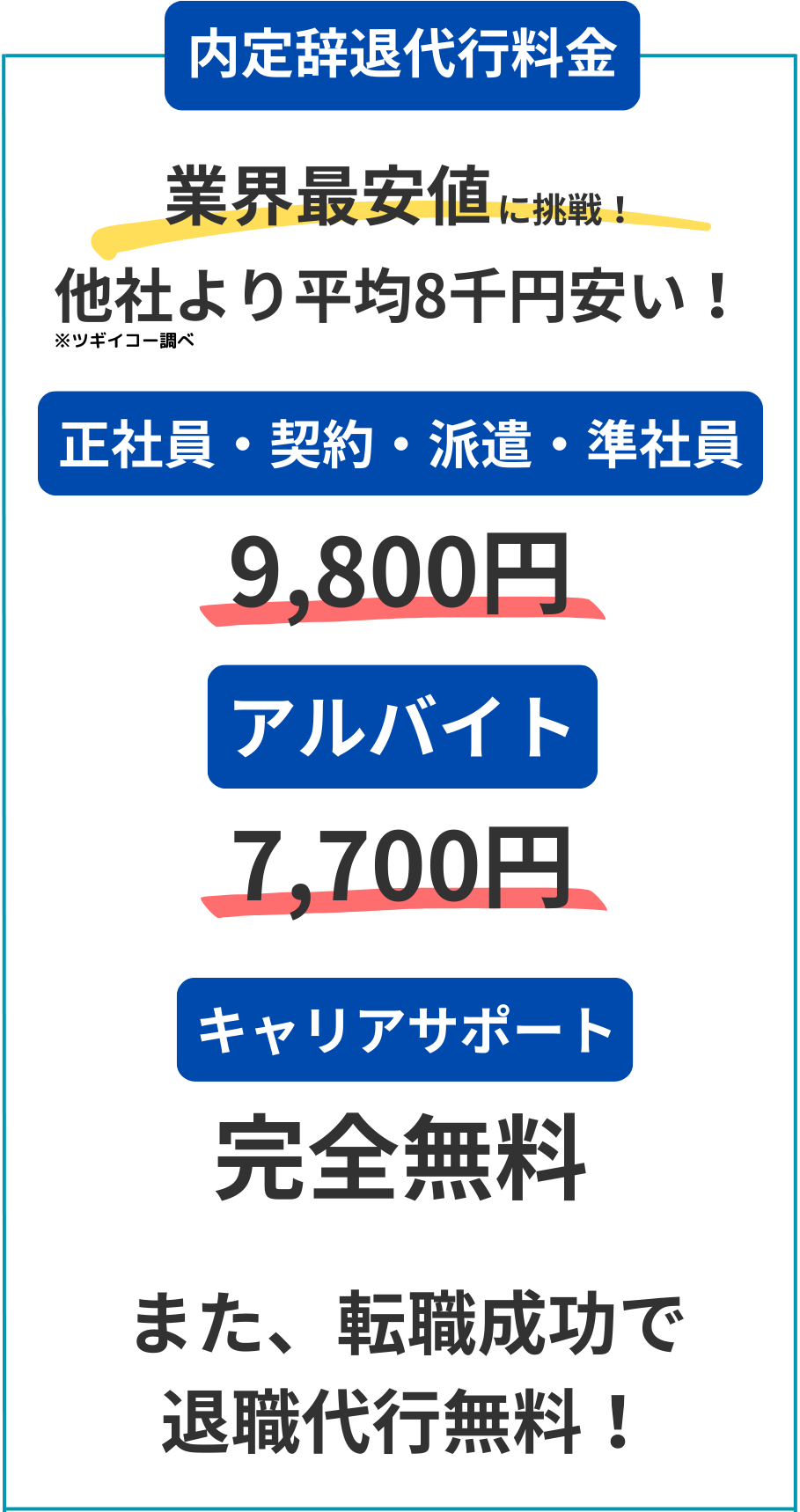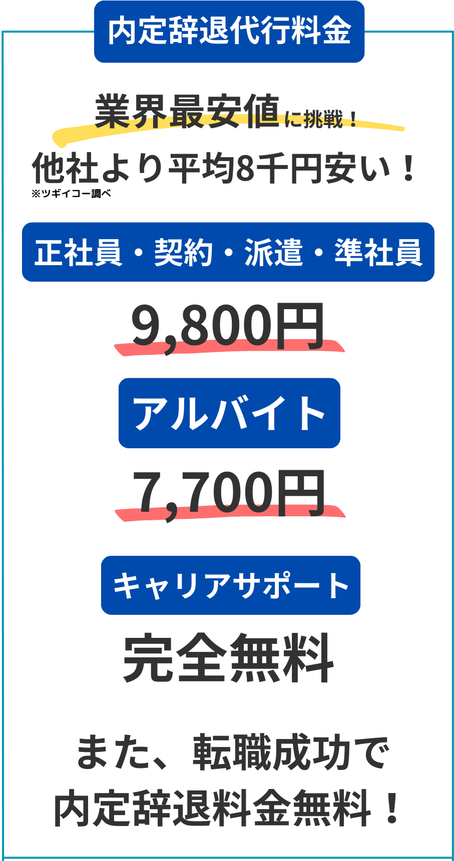 単純に、利益をご依頼者様に還元しているためです。顧問弁護士もいますし、経費のかけ具合もサービスの内容も他社と同じですが、内定辞退代行を受けるくらい辛い時に2万も3万もお金を取りたくない一心で値段を安くしています。皆さんに元気に次のキャリアに行ってほしいという思いでサービスを提供しております。