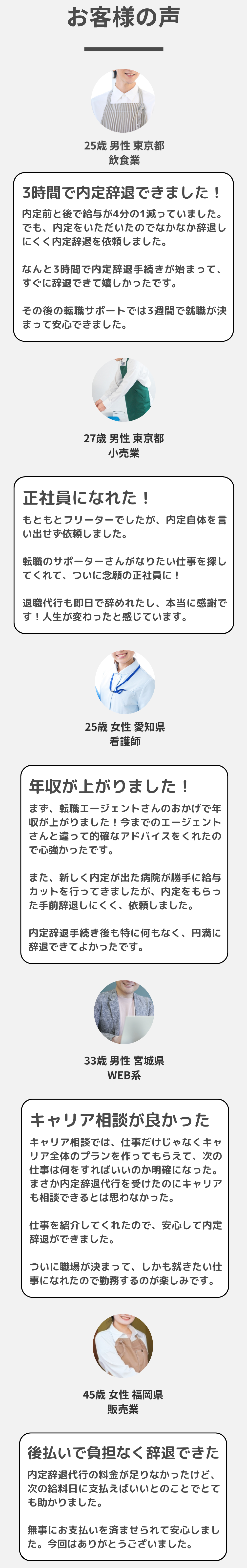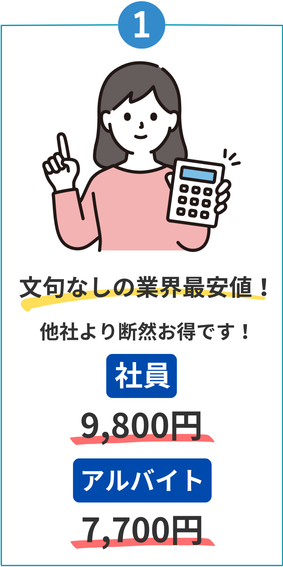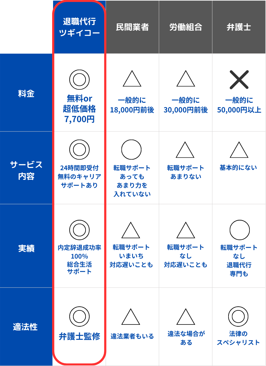 単純に、利益をご依頼者様に還元しているためです。顧問弁護士もいますし、経費のかけ具合もサービスの内容も他社と同じですが、内定辞退代行を受けるくらい辛い時に2万も3万もお金を取りたくない一心で値段を安くしています。皆さんに元気に次のキャリアに行ってほしいという思いでサービスを提供しております。