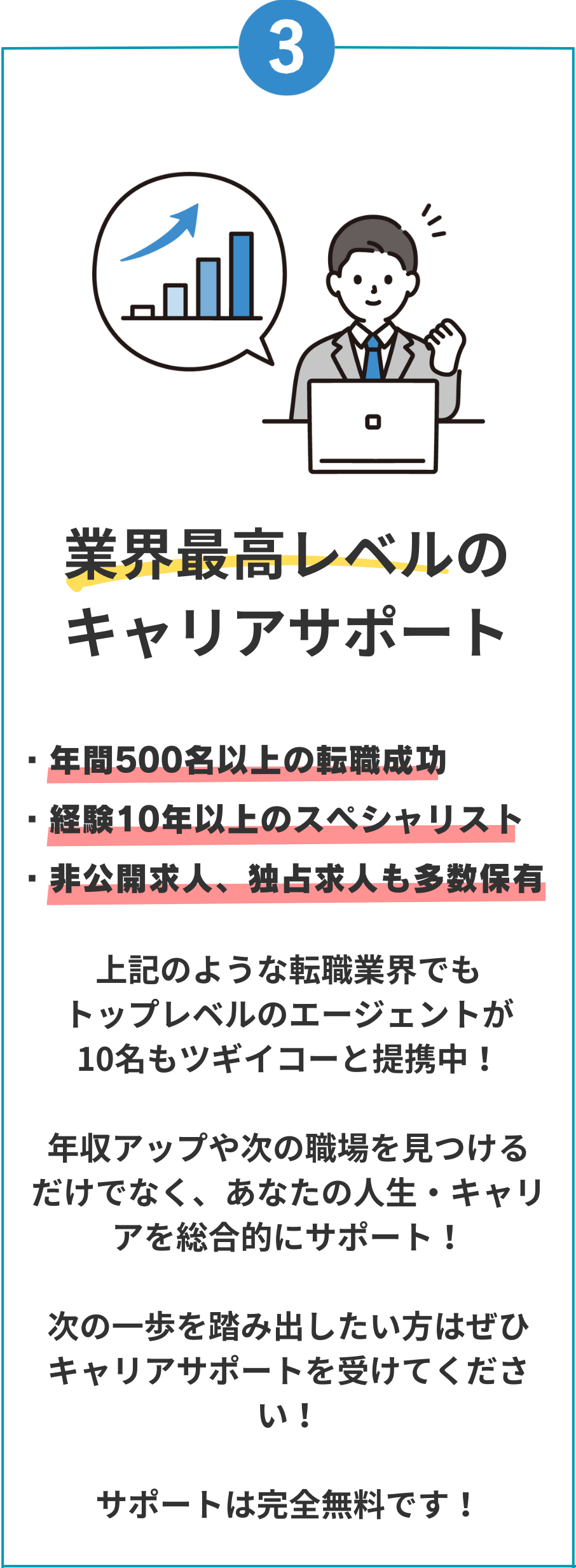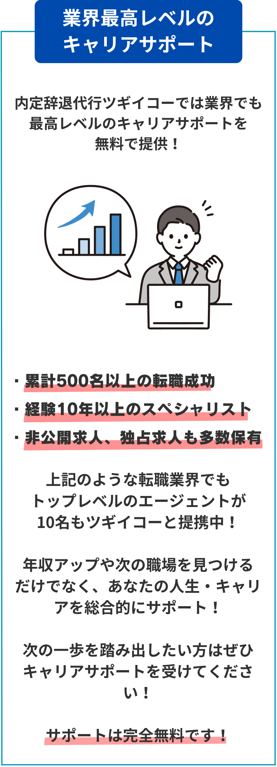 はい、転職が可能です。キャリアサポートのアドバイザーたちですが転職業界でもトップクラスの実力を持っていて、10人以上のチームで皆さんのキャリアを支えます。他のエージェントのように求人を紹介するだけでなく、人生全体のキャリアを考え、一人ひとりに合った求人を提案し、面接の練習などもするので転職成功率はかなり高いです。